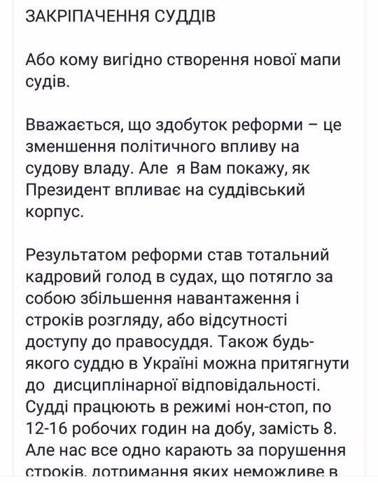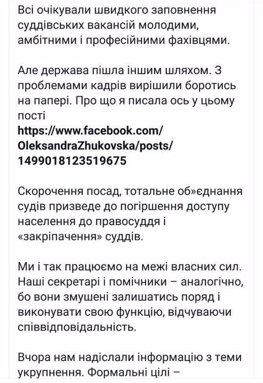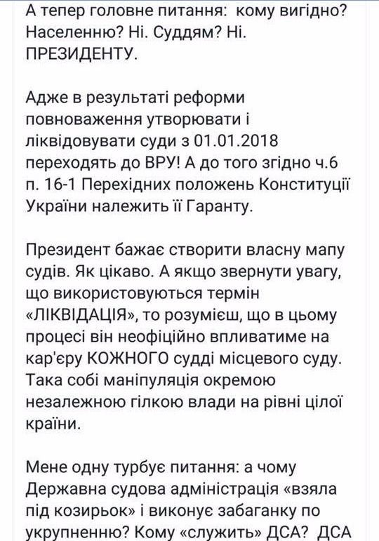 Сами судьи еще более жестко критикуют методы Банковой по наполнению (читай-опустошению) судов Украины. Судья из Ровенской области Александра Жуковская высказалась в своем Facebook, что изначально целью судебной реформы было уменьшение политического влияния на судебную власть.