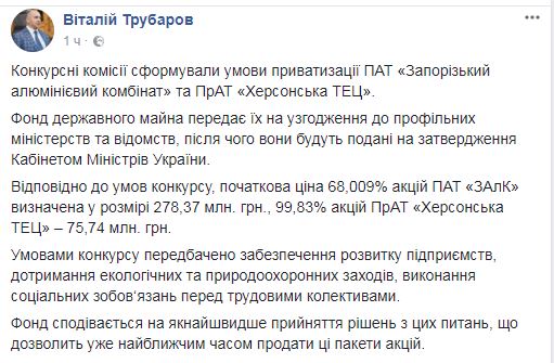 "Фонд государственного имущества передает условия приватизации на согласование в профильные министерства и ведомства, после чего они будут представлены на утверждение Кабинетом Министров Украины", - сказал Виталий Трубаров.