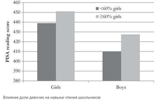 Выяснилось, что навыки чтения, измеренные по разработанной PISA шкале, значительно лучше в тех школах, где 60 и более процентов учащихся составляют девочки, причем этот фактор влияет на мальчиков гораздо сильнее, чем на их сверстниц.
