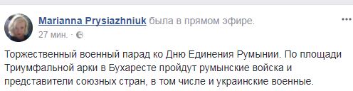 "Торжественный военный парад ко Дню Единения Румынии. По площади Триумфальной арки в Бухаресте пройдут румынские войска и представители союзных стран, в том числе и украинские военные", - написала она.