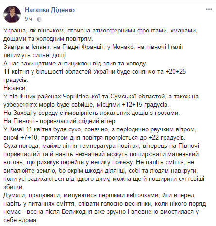 "11 апреля в большинстве областей Украины будет солнечно и +20 +25 градусов. В северных районах Черниговской и Сумской областей, а также на побережьях морей будет свежее, местами +12 +15 градусов. На Западе в среду есть вероятность локальных дождей с грозами. На Севере - порывистый восточный ветер. В Киеве 11 апреля будет сухо, солнечно, с периодически порывистым ветром, ночью +7 +10, в течение дня воздух прогреется до +22 градусов," - написала она.