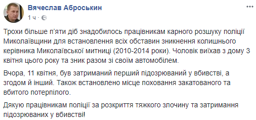 Полиция задержала двух подозреваемых в убийстве бывшего начальника Николаевской таможни Артура Полякова, который был найден убитым спустя неделю поисков.