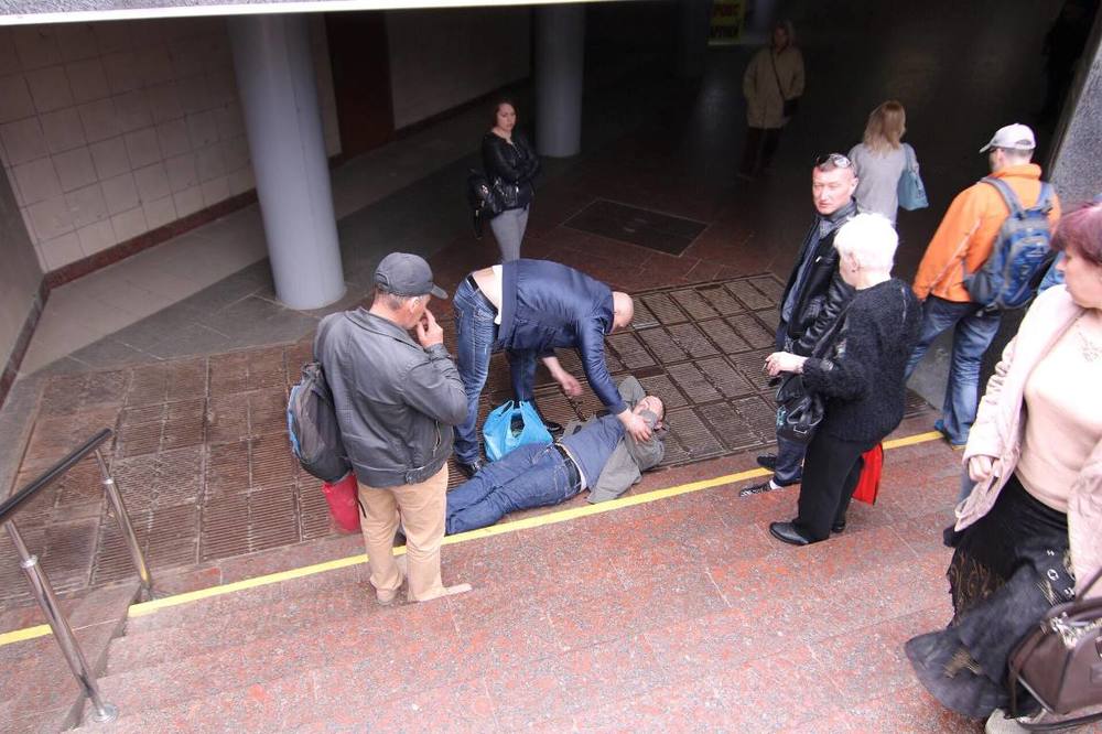 По словам очевидцев, мужчина стоял возле парапета над входом в переход. При падении он отломал фонарь уличного освещения и оказался внизу ступеней.