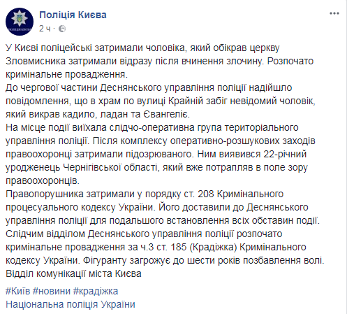 В Киеве полицейские задержали парня, который украл из церкви кадило, ладан и Евангелие.