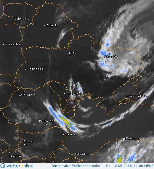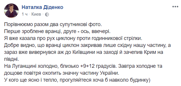 "Сравниваем два спутниковых фото. Первое сделанное утром, второе - вот вечером. Я уже говорила о движении циклона против часовой стрелки. Хорошо видно, что утром циклон закрывал только восточную нашу часть, а сейчас уже вывернулся до Киевщины на западе и зацепил Крым на юге", обращает внимание синоптик.