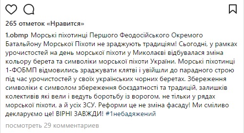 Часть военнослужащих 1-го Феодосийского отдельного батальона морской пехоты во время официальной церемонии замены беретов морской пехоты отказалась снять черные береты, о чем было сообщено на неофициальной странице в социальной сети Instagram.