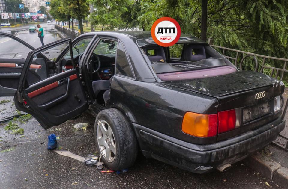 Audi 100 двигалась со стороны Демеевской площади по Голосеевскому в сторону Одесской площади. По неизвестной причине машина выехала на полосу встречного движения и врезалась в столб, потом снесла ограждение и дерево.