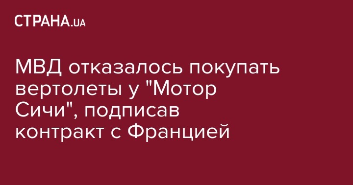Министерство внутренних дел отказалось покупать вертолеты для своих нужд у крупнейшего производителя авиационных двигателей для самолетов и вертолетов и газотурбинных установок компании "Мотор Сич" (Запорожье), подписав контракт на поставку 55 вертолетов с Францией.
