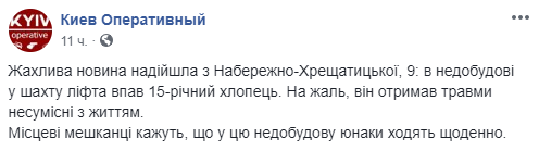 "Ужасная новость поступила с Набережно-Крещатицкой, 9: в недострое в шахту лифта упал 15-летний парень. К сожалению, он получил травмы несовместимые с жизнью", - сказано в сообщении.