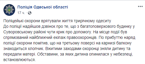 В Одессе полиция спасла 3-летнего мальчика, который оказался на карнизе балкона третьего этажа жилого дома. Об этом сообщили в Facebook пресс-служба Одесской области.