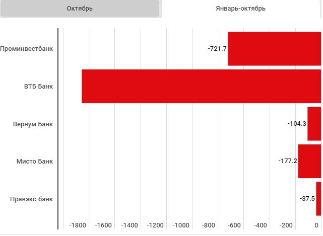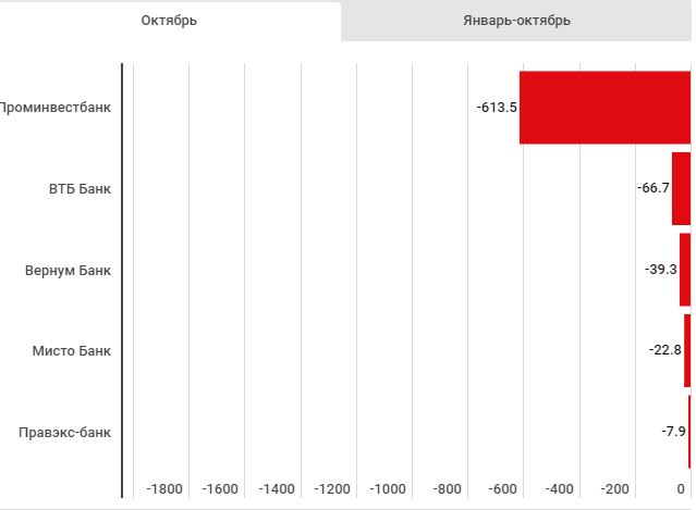 Самыми убыточными были банки с российским капиталом: Проминвестбанк потерял 613,5 млн гривен, а ВТБ Банк - 66,7 млн гривен. В ноябре в ВТБ Банк вошла временная администрация после признания банка неплатежеспособным.