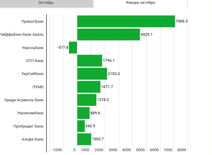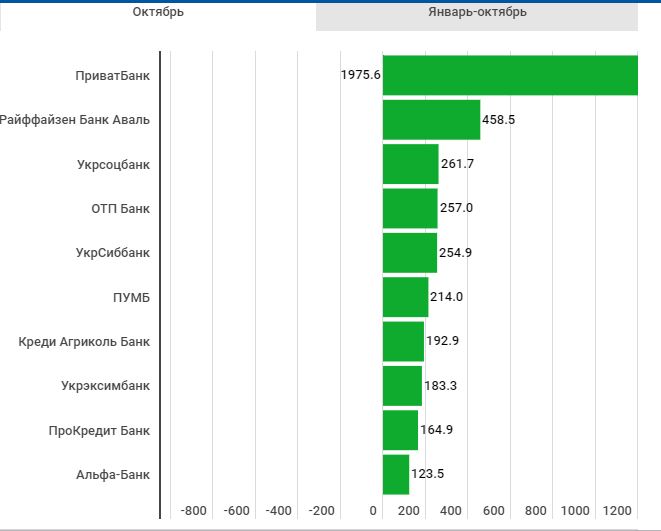 Так в октябре его прибыль составила 1976 млн. гривен, в январе-октябре - 7068 млн. гривен. Второе место в октябре с прибылью в 458,5 млн гривен занял Райффайзен Банк Аваль, за год - 4529 млн. гривен. Топ-3 за октябрь неожиданно замыкает Укрсоцбанк (261,7 млн гривен), который по итогам января-сентября был убыточным.
