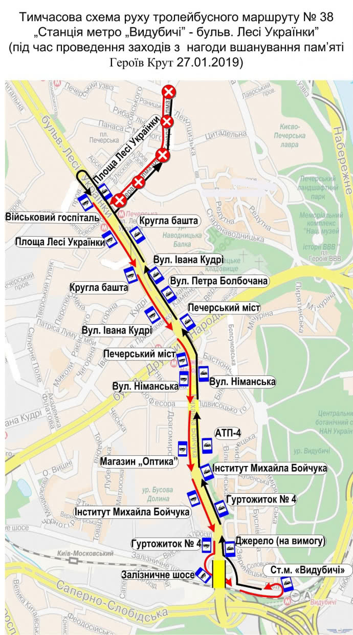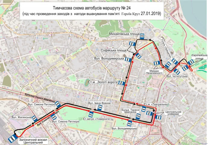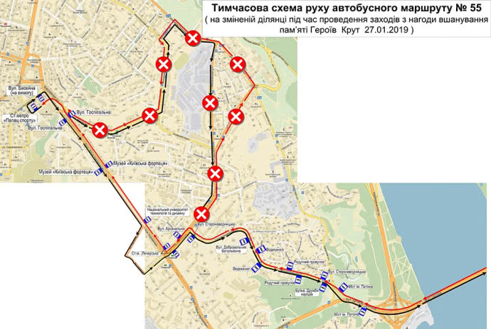 На время мероприятий по чествованию памяти Героев Крут в столице предусмотрены изменения в маршрутах троллейбусов № 38, автобусов №№ 24, 55, 62.