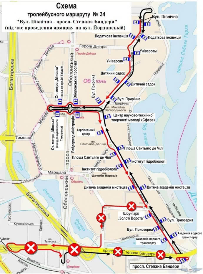 Движение будет организовано по маршруту: ул. Северная - ул. Героев Сталинграда - ул. Маршала Тимошенко - ст. м "Минская" - ул. Маршала Тимошенко - просп. Героев Сталинграда - ул. Степана Бандеры.