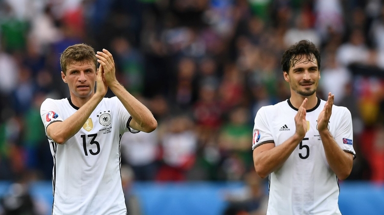 Футболисты сборной Германии Томас Мюллер и Матс Хуммельс благодарят болельщиков за поддержку, фото: uefa.com