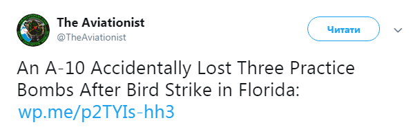 В США (штат Флорида) штурмовой самолет A-10 Thunderbolt II произвел бомбометание учебными боеприпасами после столкновения с птицей. Никто не пострадал, но военные попросили не приближаться к снарядам.