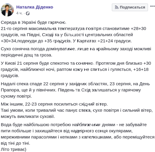 В среду, 21 августа, во всей Украине ожидается жаркая погода, и лишь на крайнем западе страны возможен дождь. Синоптик Наталья Диденко в Facebook рассказала о том, чего же сегодня украинцам следует ждать от погоды.