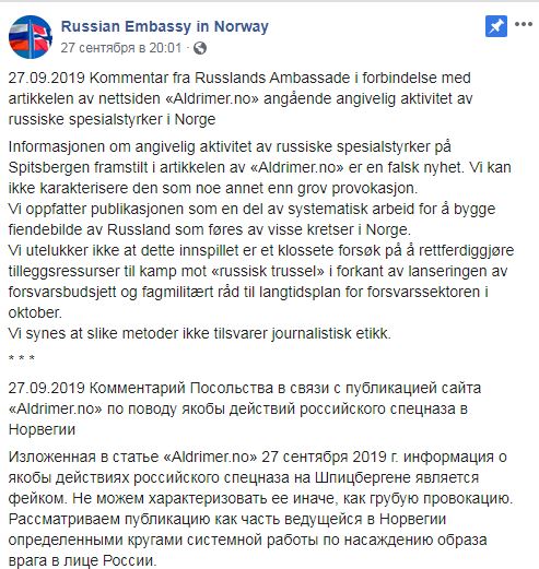 Посольство России в Осло назвало грубой провокацией статью интернет-издания. "Изложенная в статье Aldrimer.no 27 сентября 2019 года информация о якобы действиях российских спецназовцев на Шпицбергене является фейком. Мы не можем охарактеризовать ее иначе, как грубую провокацию", - заявило посольство на странице в Facebook.
