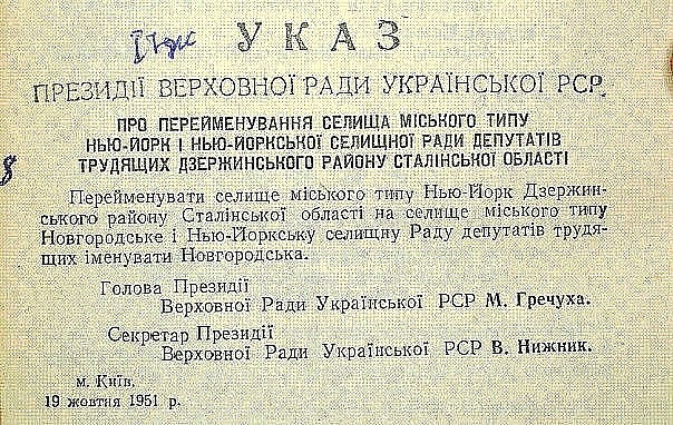 Название Нью-Йорк для жителей не новое, а историческое. По данным издания Этнографический Донбасс, населенный пункт основали в 1877 году немцы, которых пригласила императрица Екатерина II. Поселок городского типа пробыло с таким названием до 1951 года. Президиум Верховного Совета Украинской ССР издали указ о переименовании поселка городского типа Нью-Йорк в Новгородское.