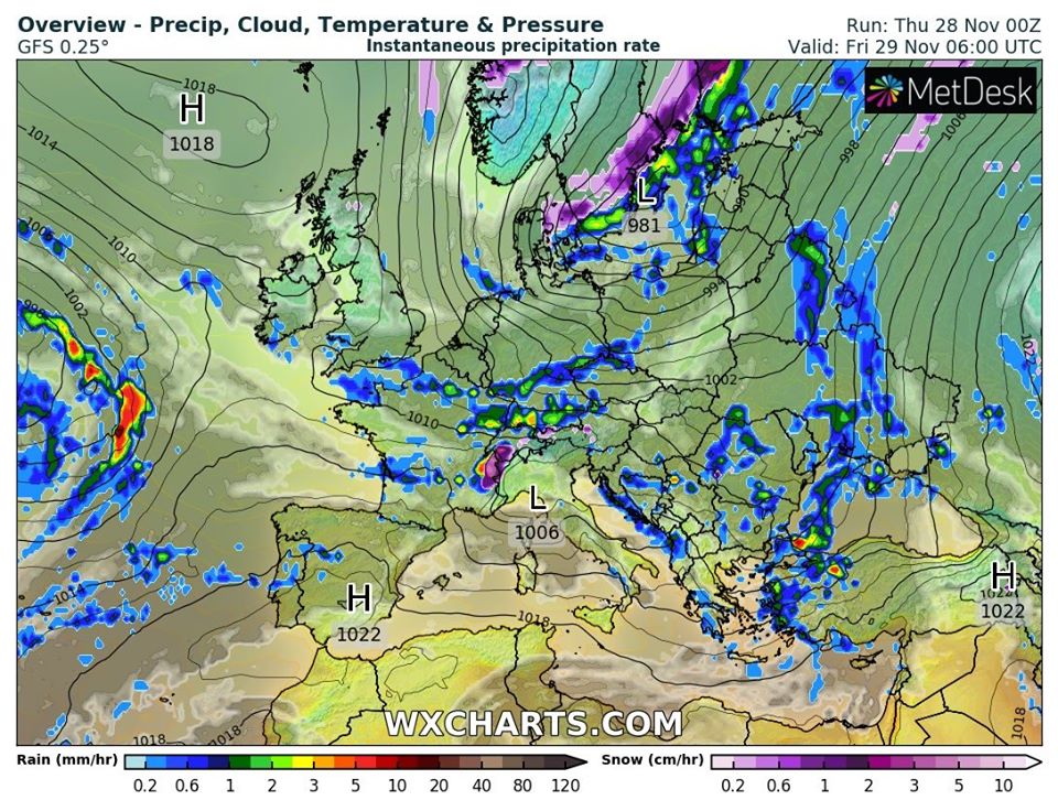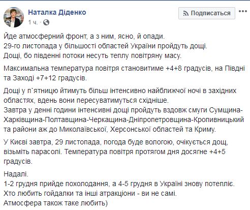 В Украине в пятницу, 29 ноября, ожидается дождливая погода.  Об этом сообщила на своей странице в Facebook синоптик Наталья Диденко.