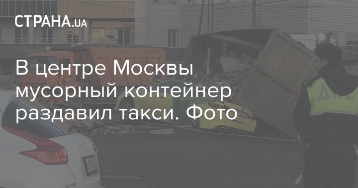 В центре Москвы произошло необычное ДТП. Автомобиль такси был раздавлен контейнером с мусором, который свалился с платформы грузовика. Слава Богу, в результате происшествия никто не пострадал.