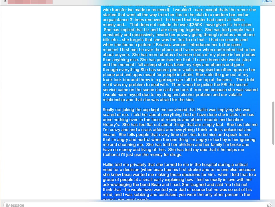 Согласно сообщениям Хантера, у будущего президента были веские причины для беспокойства, так как телефон Хантера был заполнен компрометирующими сообщениями, поскольку отношения Хантера с Халли распались.