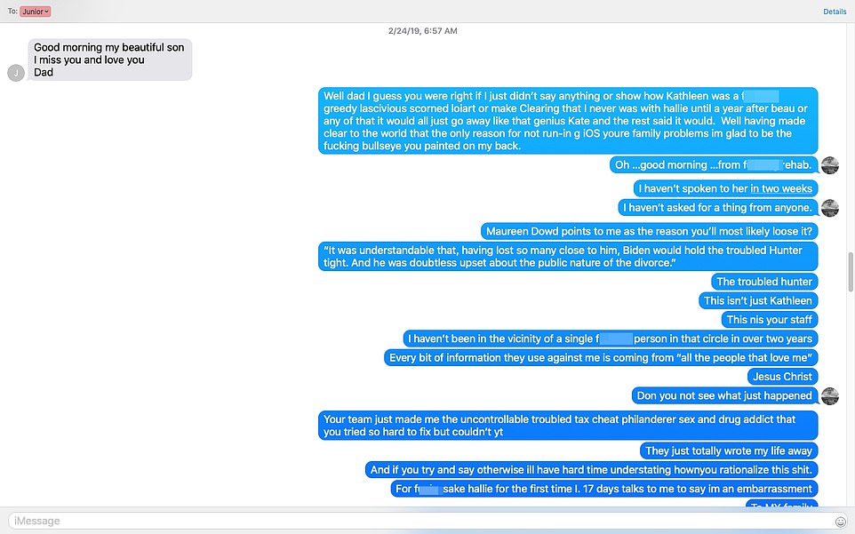 Хантер пожаловался, что совет его отца не защищаться в СМИ из-за историй о его сложном разводе с бывшей женой Кэтлин Байден и его романе с вдовой своего брата Халли имели неприятные последствия, и добавил саркастически: "О… доброе утро… из еб@@@й реабилитации.