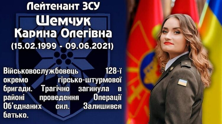 "Вчера во время выполнения служебных обязанностей трагически погибла военнослужащая 128-й отдельной горно-штурмовой бригады, лейтенант Карина Шемчук", - написал Петров.