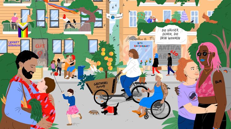 Как объясняет партия "Зелёных", на картинке показан город будущего, где "арендная плата доступна для всех".