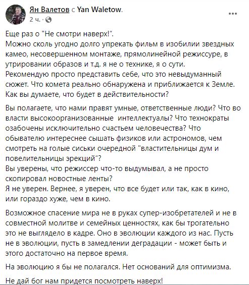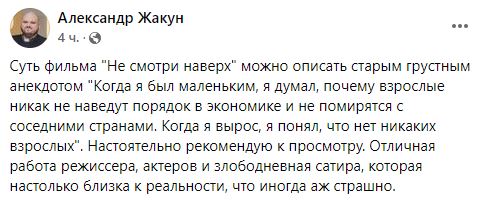 "Суть фильма "Не смотри наверх" можно описать старым грустным анекдотом: "Когда я был маленьким, я думал, почему взрослые никак не наведут порядок в экономике и не помирятся с соседними странами. Когда я вырос, я понял, что нет никаких взрослых". Настоятельно рекомендую к просмотру. Отличная работа режиссера, актеров и злободневная сатира, которая настолько близка к реальности, что иногда аж страшно", - написал священник Александр Жакун.