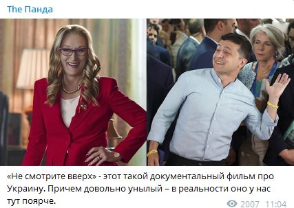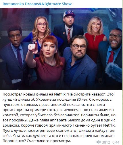 В Украине это творение студии Netflix заняло первое место по смотрению. Но, вероятно, не только потому, что в главных ролях снялись такие знаменитости, как Леонардо ди Каприо и Мерил Стрип. Но и в силу схожести ситуации с украинской.