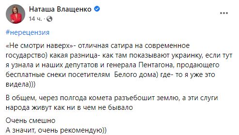 "Не смотри наверх"- отличная сатира на современное государство... В общем, через полгода комета раз@бошит землю, а эти слуги народа живут как ни в чем не бывало. Очень смешно", - поделилась мнением телеведущая Наталья Влащенко.