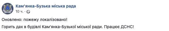"Горит крыша здания Каменка-Бугского городского совета. Работает ГСЧС!" – говорится в сообщении.