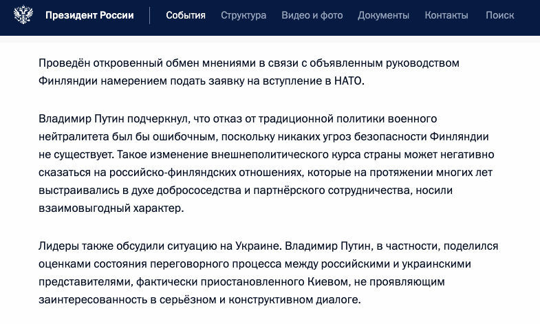 Об этом он сказал в телефонном разговоре с президентом Финляндии.