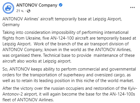 Также в компании добавили, что "после победы над рашистскими оккупантами и проведения комплекса работ по восстановлению работоспособности аэропорта "Киев-Антонов-2", он снова станет базовым для флота "Русланов" авиакомпании "Авиалинии" АНТОНОВ".
