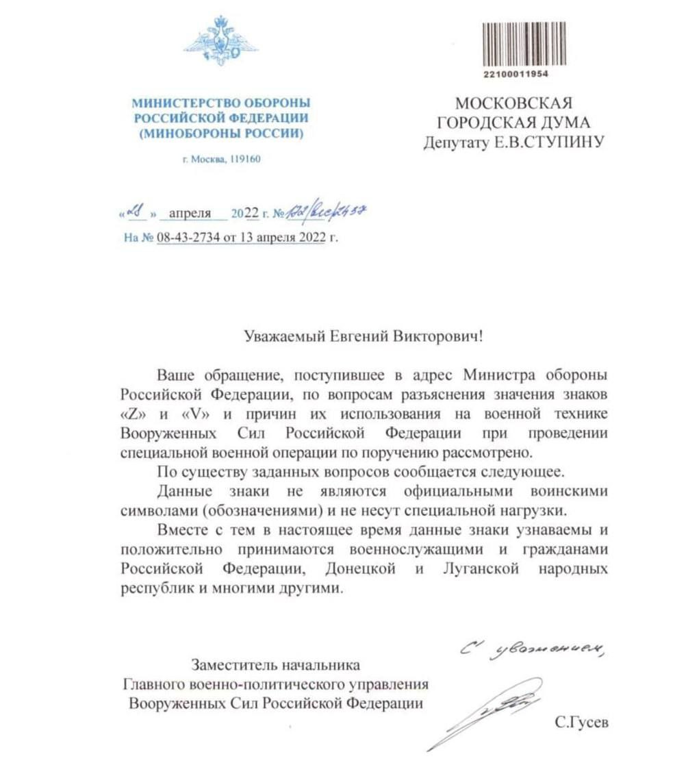 Об этом говорится в ответе Минобороны РФ на обращение депутата московской городской Думы Евгения Ступина.