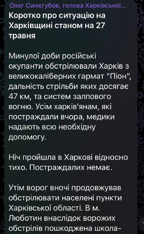 Об этом сообщил в Telegram губернатор Олег Синегубов.
