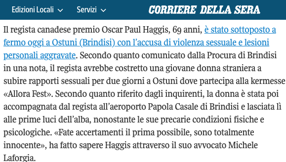 Обладатель "Оскара" канадско-американский сценарист и режиссёр Пол Хаггис задержан в Италии по обвинению в изнасиловании.