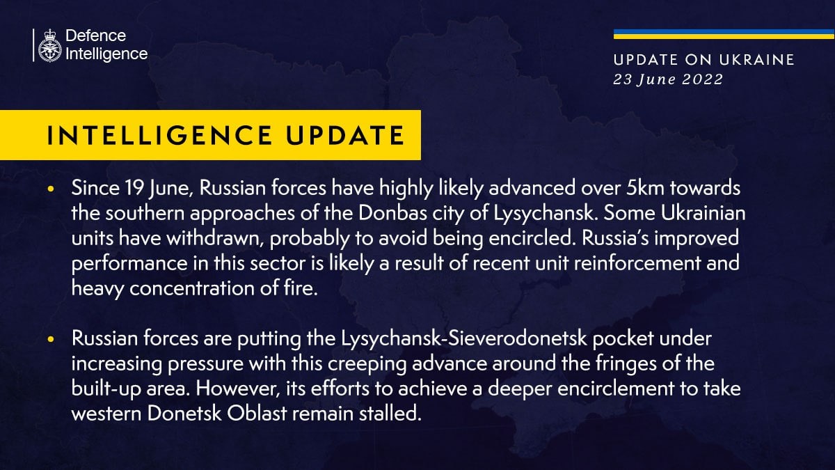 С 19 июня российские силы, скорее всего, продвинулись более чем на пять километров к южным подступам Лисичанска.