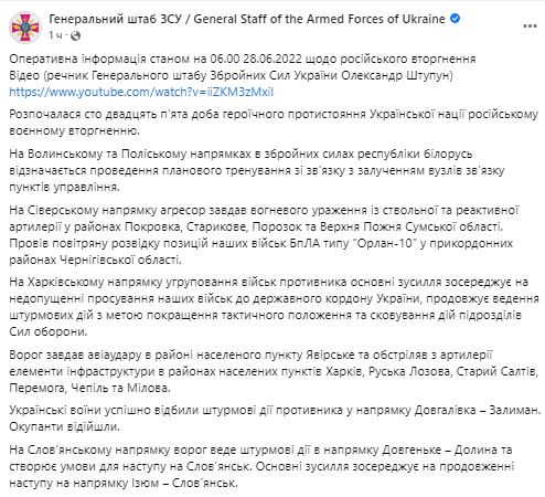 Генштаб Вооруженных сил Украины обнародовал сводку о ситуации на фронте по состоянию на утро 28 июня.