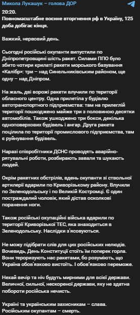 Как выяснилось позже, вражеская ракета попала в СТО в Днепре. На местном СТО не было никакой военной техники, военных или оружия. На данный момент под завалами находятся люди, на месте работают спасатели. В целом в Днепропетровскую область летело 6 ракет. Три сбила ПВО. Помимо попадания в СТО, пострадали также железнодорожная инфраструктура и промышленное предприятие.