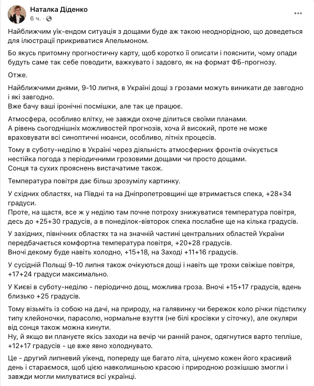 Об этом пишет синоптик Наталья Диденко.