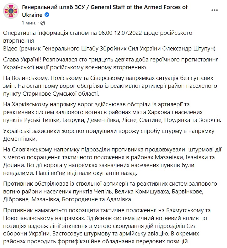 Утром во вторник, 12 июля, Генштаб ВСУ опубликовал аткуальную сводку о происходящем на фронте. Сообщается, что ВСУ отбили штурмы противника на Славянском направлении - в районах Мазановки, Ивановки и Долины.