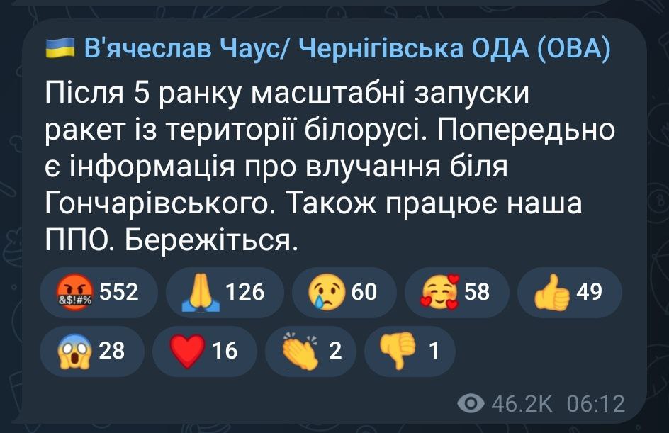 Губернатор Черниговской области Вячеслав Чаус сообщил о массированных ракетных залпах с территории Беларуси. И попадании в районе поселка Гончаровский.