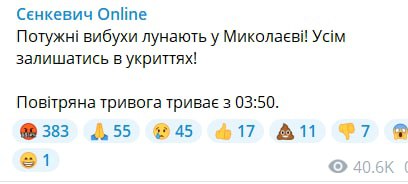В Николаеве ночью были мощные взрывы, по словам градоначальника Александра Сенкевича. Другой информации пока нет.
