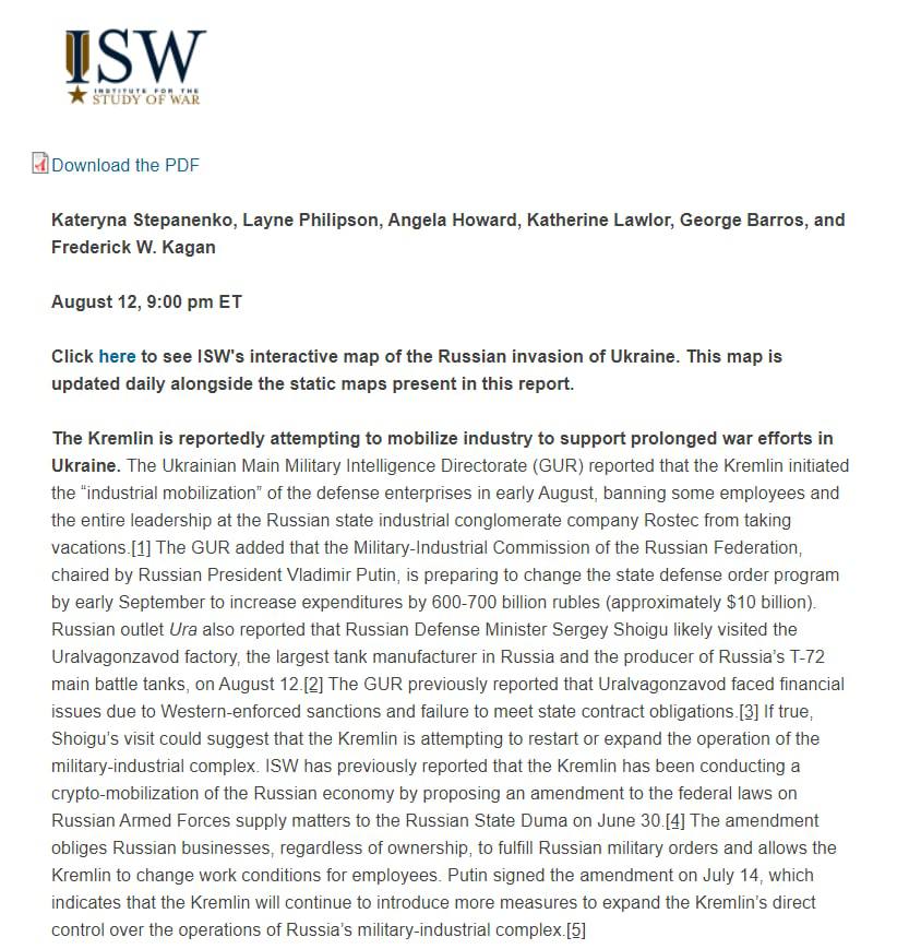 Как отмечает американские аналитики, Главное управление военной разведки Украины (ГУР) сообщило, что Кремль инициировал "производственную мобилизацию" оборонных предприятий в начале августа, запретив некоторым сотрудникам и всему руководству российского государственного промышленного конгломерата Ростех брать отпуска.