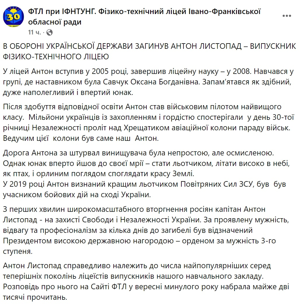 О его смерти сообщает Ивано-Франковский физико-технический лицей, в котором учился Листопад.