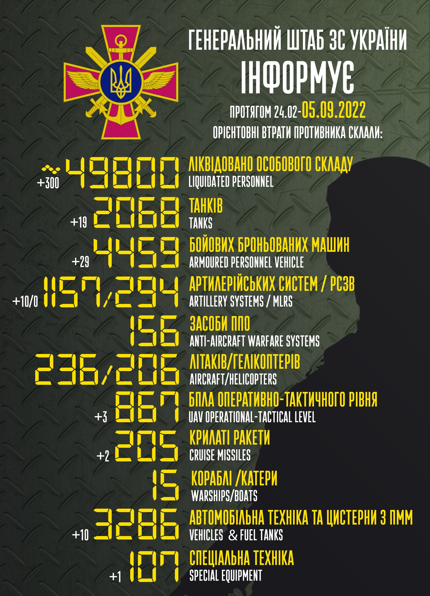 Генштаб Вооруженных сил Украины опубликовал данные по общим боевым потерям противника с начала его нападения на Украину - в период с 24 февраля по 5 сентября.