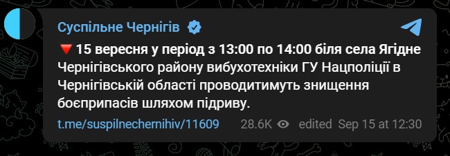 По данным "Суспильного", в период с 13:00 до 14:00 возле села Ягодное Черниговского района взрывотехники Нацполиции в Черниговской области будут производить уничтожение боеприпасов.