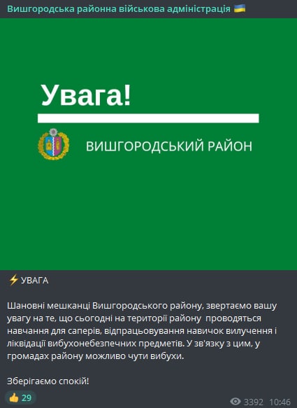 Как сообщает Вышгородская районная военная администрация, взрывы в Киевской области связаны с учениями саперов, они будут отрабатывать навыки изъятия и ликвидации взрывоопасных предметов.